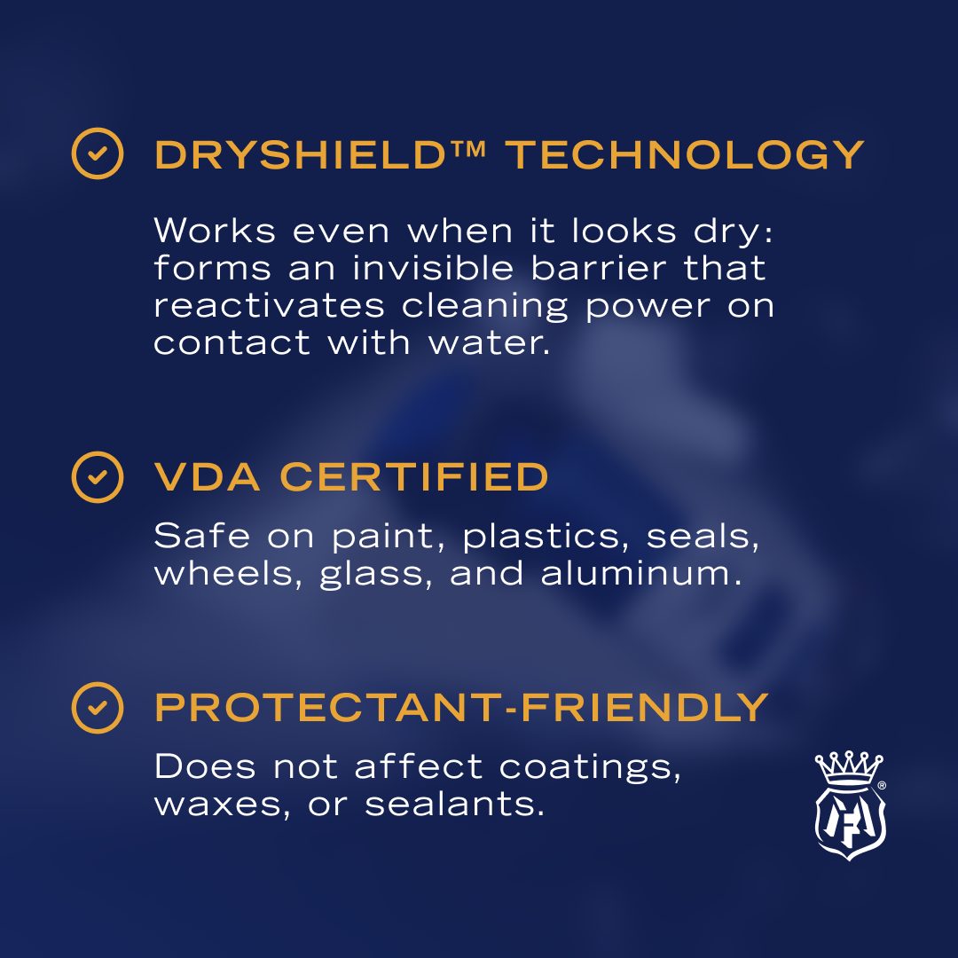 Its DryShield™ Technology is a true innovation. Even when the surface appears dry, INITIO pauses its action and resumes cleaning when water is applied. This invisible barrier slows evaporation and allows the surfactants to continue removing contaminants, even under direct sunlight or on hot surfaces.