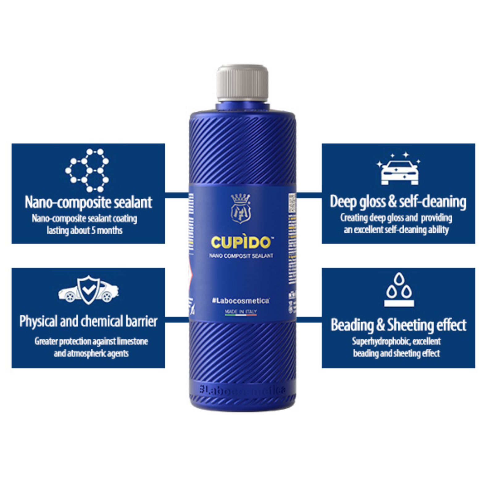 CUPIDO is a nano composite sealant that combines the deep gloss of carnauba wax with the long-lasting protection of nanotechnology. Easy to apply, it creates a flexible, durable barrier against chemical and mechanical stress, ensuring shine, smoothness, and protection for up to 9 months.