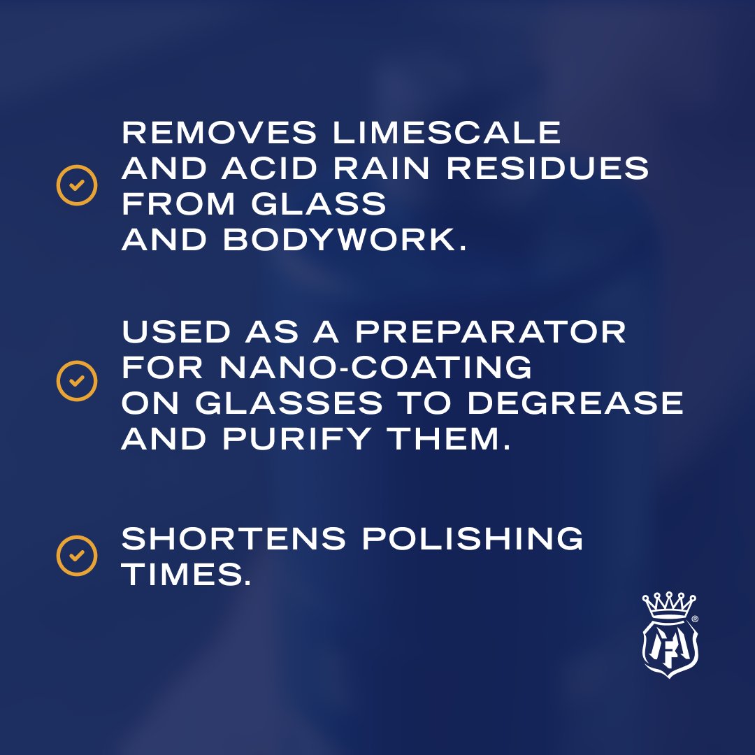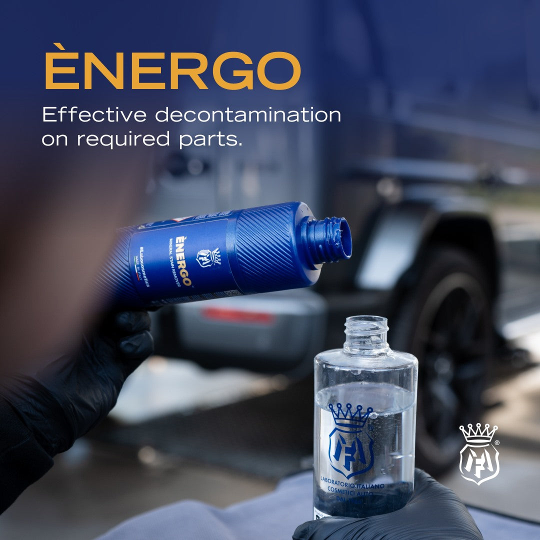 ENERGO is an advanced mineral stain remover designed to eliminate tough limescale and acid rain deposits from both paintwork and glass. These contaminants are among the hardest to remove, often resisting traditional polishing methods. With ÈNERGO, detailers can save time and achieve a flawless finish even on severely affected surfaces.