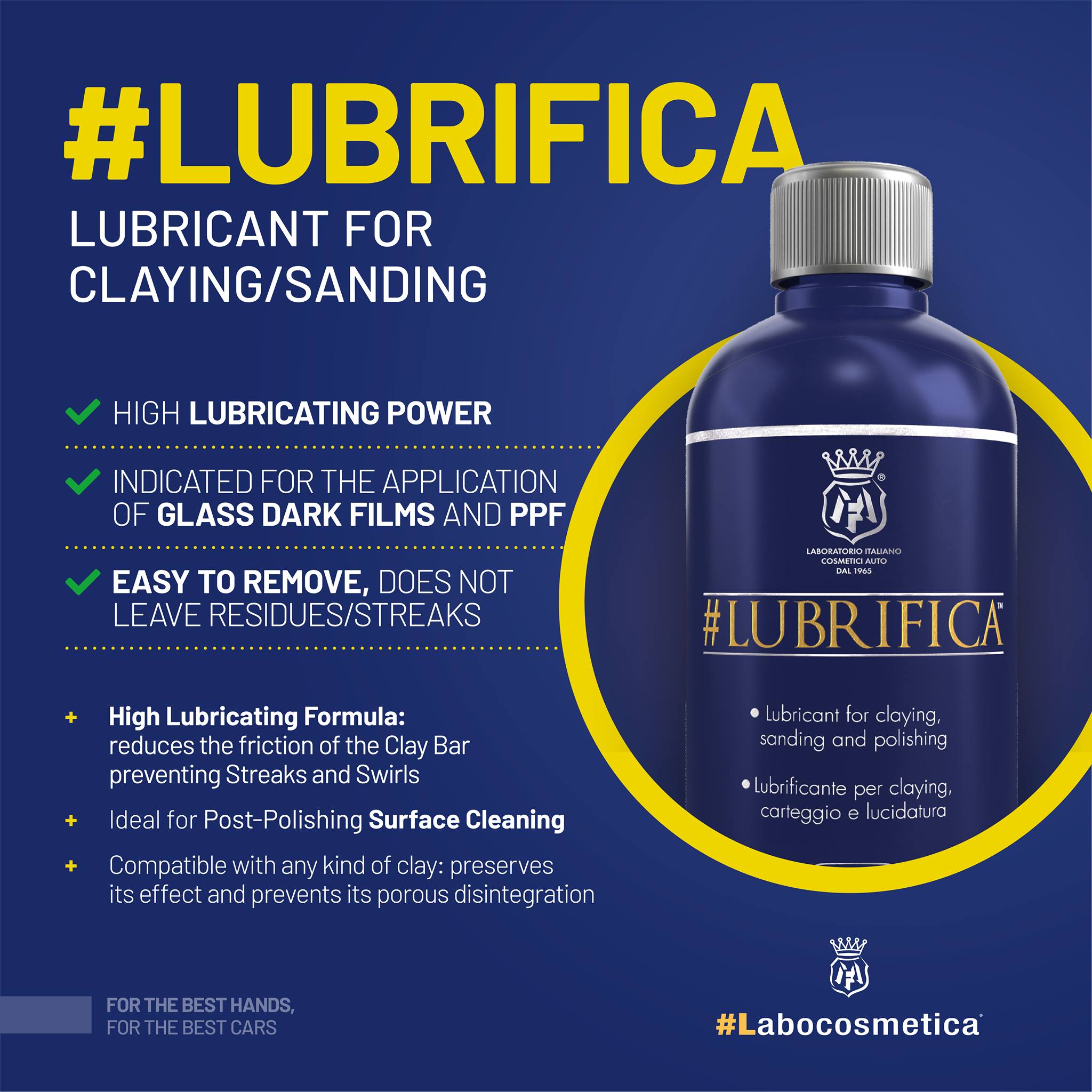 LUBRIFICA by Labocosmetica® is the ultimate multi-purpose lubricant designed for claying, sanding, polishing, and film application. Its innovative formula forms a lubricated anti-adherent cushion that drastically minimizes friction, allowing clay bars, mitts, and blocks to glide smoothly and safely across the surface without leaving scratches, swirls, or haze.