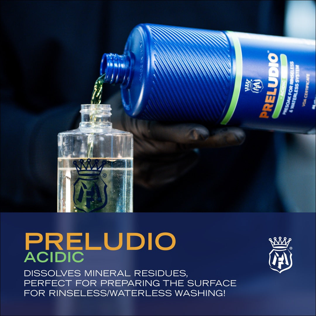 Preludio Acidic is a powerful, yet gentle acidic presoak for rinse-less and waterless washing systems. It removes mineral residues, limescale, industrial dirt, and surface oxidation, restoring clarity and protecting paint, PPF, and wraps without risking micro-scratches. Ideal for frequent use, it dissolves stubborn inorganic deposits that neutral cleaners cannot tackle.