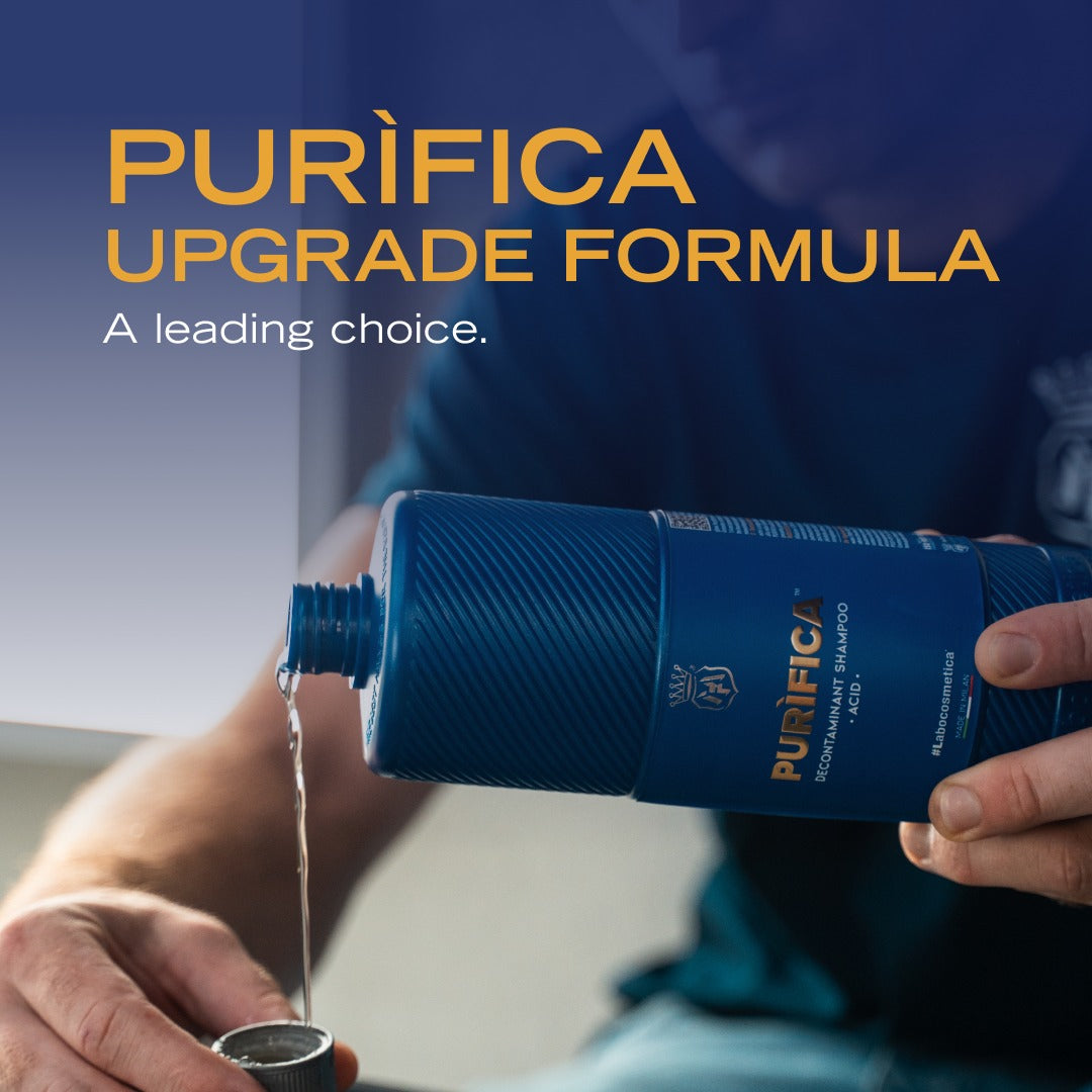 Purifica is the world’s first acid shampoo for car detailing, designed to remove invisible limescale films that dull paint and reduce shine. Safe, VDA-certified, and effective even when diluted, it restores brilliance, especially on dark-colored vehicles.