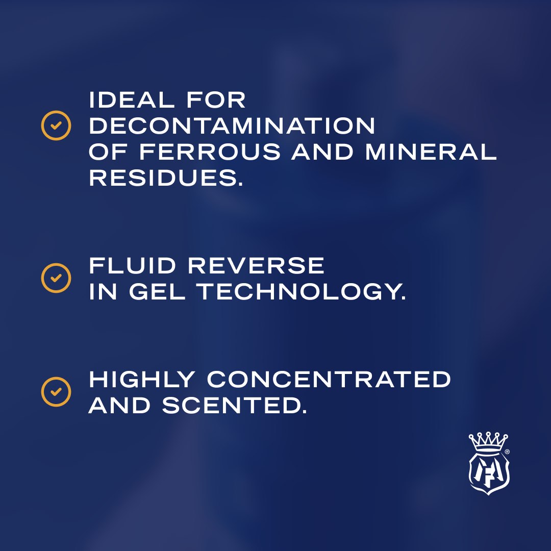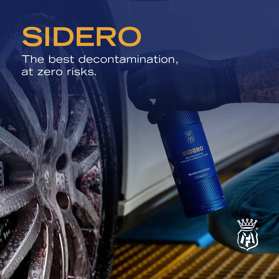 SIDERO is a highly concentrated, scented iron remover gel with anti-limescale action. Its innovative F.R.G. technology ensures strong adhesion to vertical surfaces, making it ideal for safe, effective decontamination of bodywork, rims, and glass.