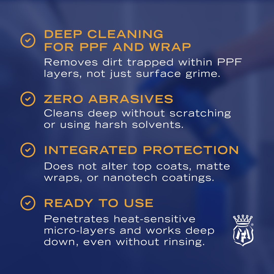 LIMPIA is specifically formulated to restore clarity and performance by working deep within the micro-layers of PPF and wraps. Inspired by professional skincare, it functions like a technical cleansing milk, gently dissolving and lifting embedded dirt while preserving the film’s elasticity, topcoat, and self-regenerating properties.
