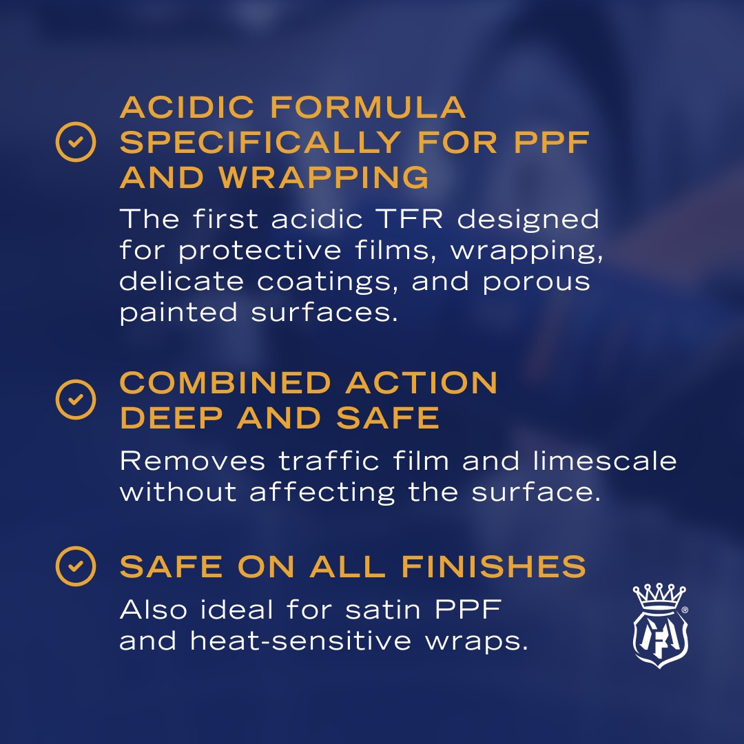 RENOVA is the first acidic pH Traffic Film Remover shampoo on the market, specifically developed for PPF, wraps, and sensitive coatings. Traditional neutral shampoos cannot reach the contaminants trapped in the micro-pores of protective films, leaving surfaces dull, yellowed, or uneven. RENOVA solves this problem with targeted, chemical-intelligent cleaning, removing stubborn dirt while preserving transparency, gloss, and protective layers.